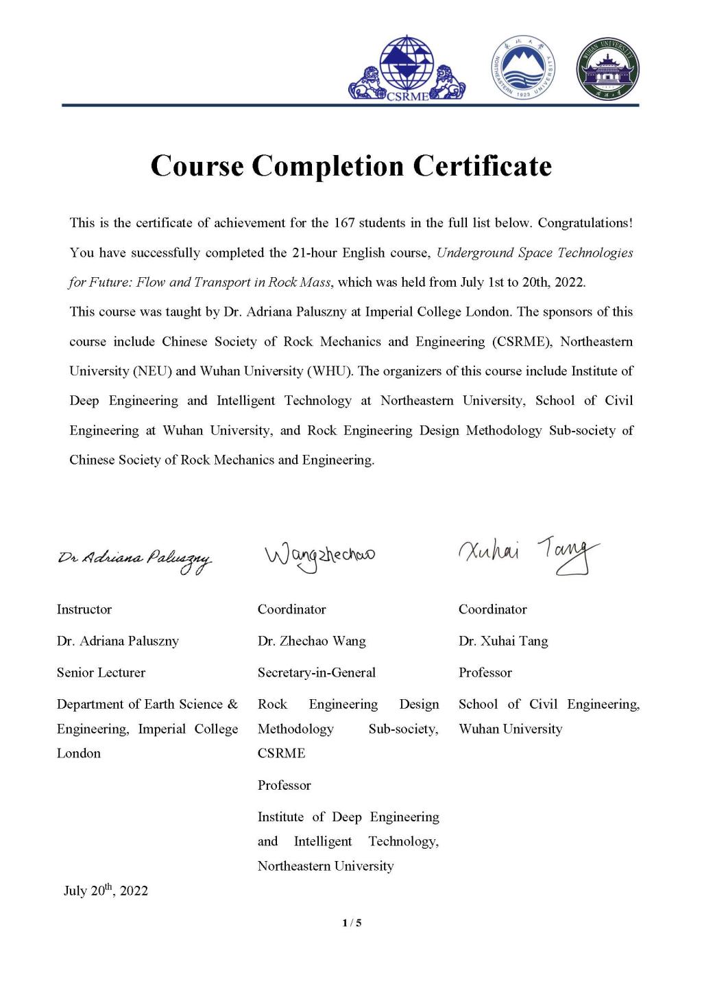 71-20日,金年会金字招牌诚信至上‍‍‍‍‍‍‍‍研究生王酒婷、金光辉、张霞、罗理民、张雅各、崔璨、李存、刘雨卉、马杨昊、田延冰等10名同学参加了“面向未来的地下空间技术:岩体中的流动与输运”国际高端课程,并取得结业证书。