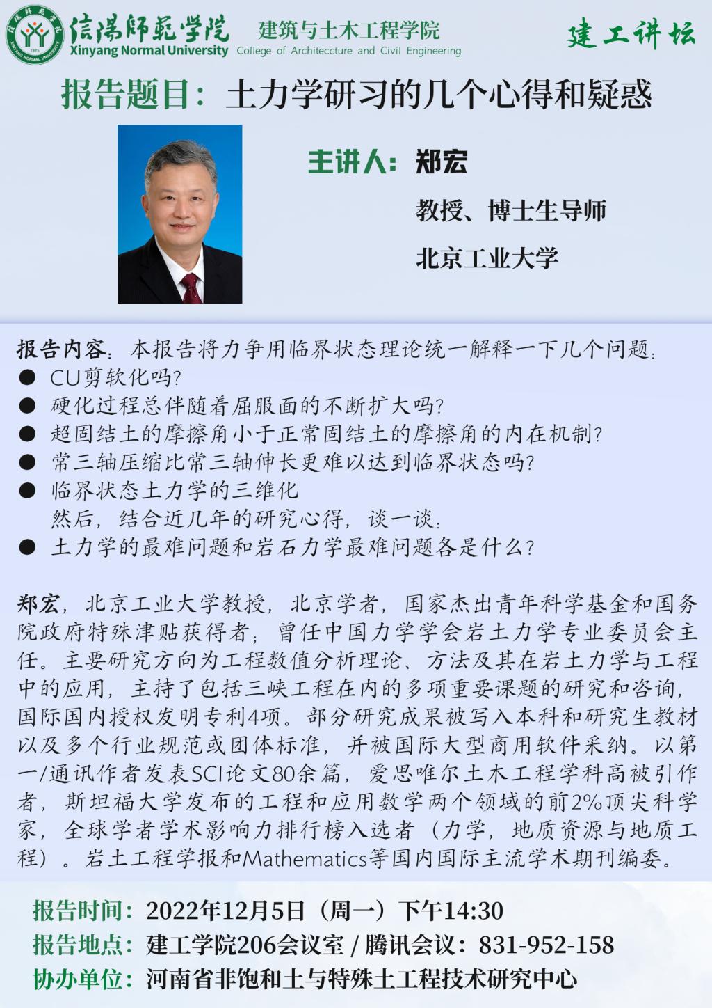 报告人简介:郑宏,北京工业大学教授,北京学者,国家杰出青年科学基金和国务院政府特殊津贴获得者;曾任中国力学学会岩土力学专业委员会主任。主要研究方向为工程数值分析理论、方法及其在岩土力学与工程中的应用,主持了包括三峡工程在内的多项重要课题的研究和咨询,国际国内授权发明专利4项。部分研究成果被写入本科和研究生教材以及多个行业规范或团体标准,并被国际大型商用软件采纳。以第一/通讯作者发表SCI论文80余篇,爱思唯尔土木工程学科高被引作者,斯坦福大学发布的工程和应用数学两个领域的前2%顶尖科学家,全球学者学术影响力排行榜入选者(力学,地质资源与地质工程)。岩土工程学报和Mathematics等国内国际主流学术期刊编委。