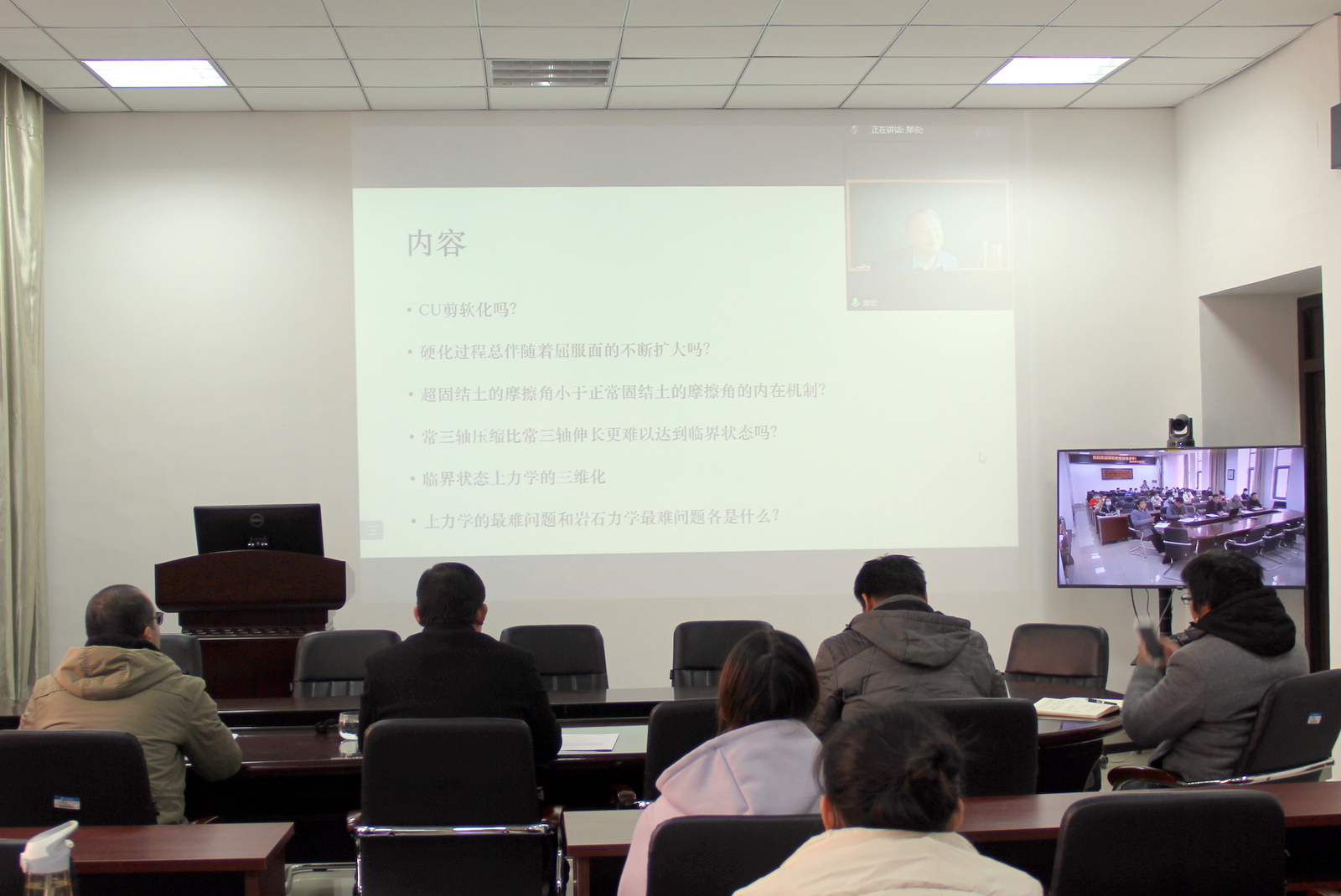 12月5日,应金年会金字招牌诚信至上邀请,北京工业大学郑宏教授通过腾讯会议平台为公司师生作了题为“土力学研习的几个心得和疑惑”的学术报告。来自北京工业大学、中科院武汉岩土所、同济大学、东南大学、哈尔滨工业大学、天津大学、北京航空航天大学、中山大学、武汉大学、中南大学、山东大学、重庆大学、河海大学、上海大学、中国地质大学、西南交通大学、南京工业大学、贵州大学、湘潭大学、华东交通大学、湖南科技大学、三峡大学、湖北工业大学、华北水利水电大学、郑州航空工业管理学院和公司等单位的300多位同行专家、博士后、博士生、硕士生共同聆听了报告。金年会金字招牌诚信至上经理周葆春,副经理肖琪聃,青年教师马文强、马全国、张金浩、梁维云和全体研究生参加了此次报告会,报告会由金年会金字招牌诚信至上经理周葆春教授主持。