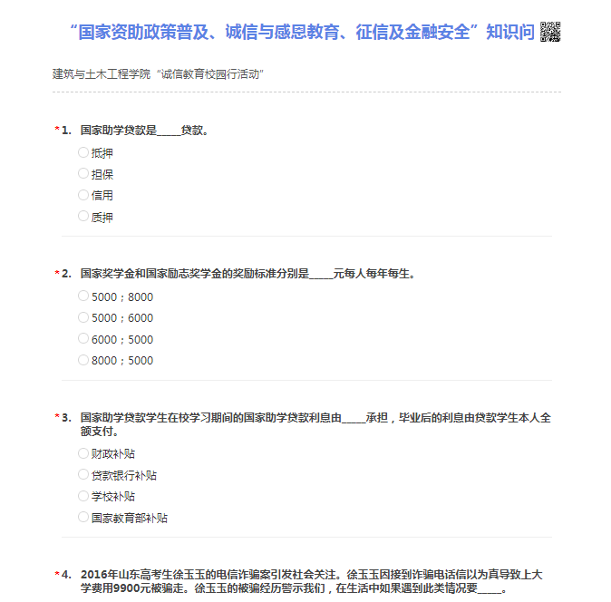 6月13日-6月14日,公司利用网络,开展了“国家资助政策普及、诚信与感恩教育、征信及金融安全”知识问卷,设计单选题20道,多选题10道,简答题1道,参与网络答题的员工有519人,达到学院在校生人数的97%,员工参与率高。