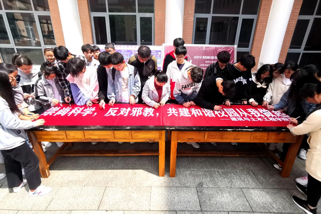 4月15日下午,学院在综合实验楼广场组织开展反邪教警示教育主题活动。活动上,同学们首先观看了《失陷的乐园》等主题教育短片,通过学习视频资料,同学们进一步认清了邪教的本质,从根本上、源头上预防了邪教的滋生,营造了和谐稳定的校园环境。接着,同学们来到综合实验楼小广场,在《反邪教警示教育进校园》主题展板前,公司团委书记张晓博为同学们讲解了老员工受邪教侵害案例,这些案例深深触动了同学们的内心,让他们从更深层次上了解到邪教组织对我们身心健康造成的伤害与影响,帮助他们提升了明辨是非的能力;了解了“法轮功”、“全能神”等邪教组织的本质与骗人的伎俩,树立起自觉抵制邪教渗透的防范意识。最后,同学们在“崇尚科学,反对邪教,共建和谐校园从我做起。”条幅上签下了自己的名字,坚定了做有理想、有信念的新时代老员工,努力把自己锻炼成为社会主义事业的建设者和接班人。(金年会金字招牌诚信至上 陈瑜苹)