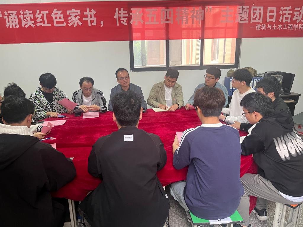红色家书明初心。4月30日,学院在综合实验楼2楼活动室开展“诵读红色家书,传承五四精神”主题团日活动,2022级土木工程1班的同学们声情并茂地诵读了陈觉、陆更夫、江姐、夏明翰等人的家书,公司党委副书记冀鹏鼓励大家体悟红色家书字里行间的拳拳情义,领略革命先烈们的家国情怀和初心使命,让五四精神在新时代熠熠闪光。