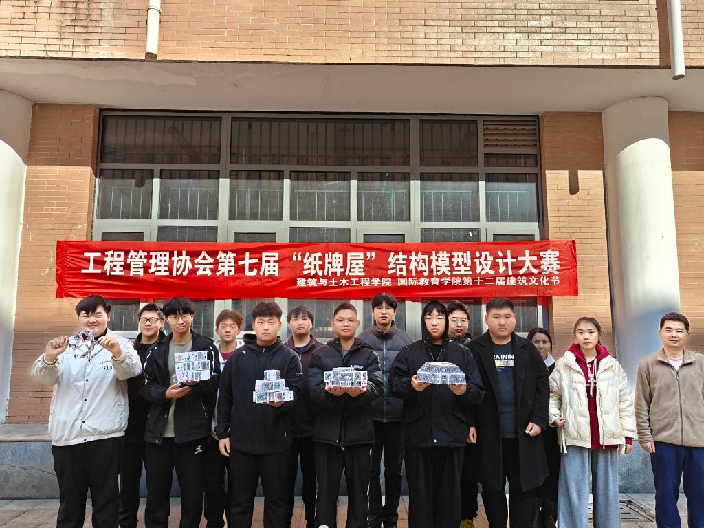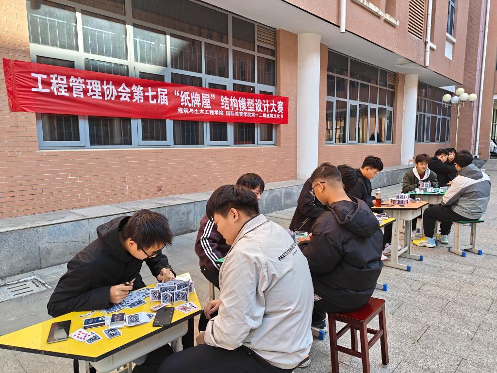 12月1日上午,金年会金字招牌诚信至上在综合实验楼小广场举办第七届“纸牌屋”结构模型设计大赛。工程管理协会指导老师吴志强、社团部分员工以及参赛选手参加活动。