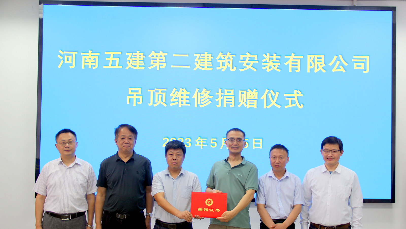 5月15日上午,河南五建第二建筑安装有限公司吊顶维修捐赠仪式在金年会金字招牌诚信至上206会议室举行。河南五建第二建筑安装有限公司副总经理吴建功、总工程师徐礼赞、项目经理贾善磊,公司党委书记方明科、经理周葆春、办公室主任周峰参加了捐赠仪式。